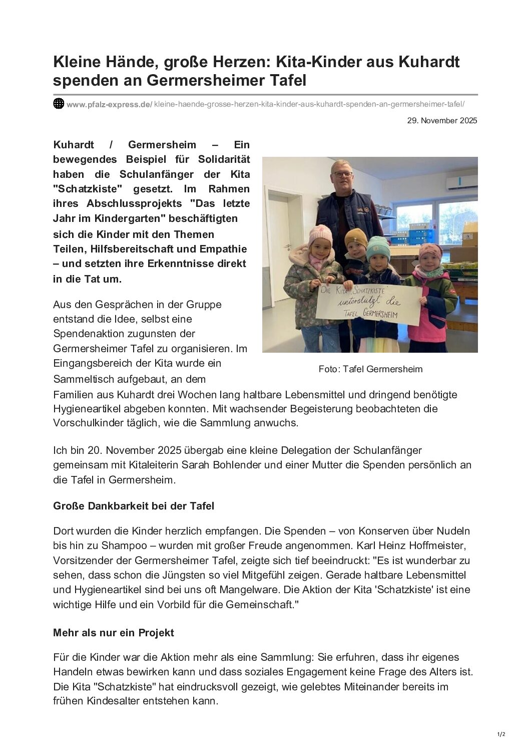 Die Tafel Germersheim bedankt sich herzlich bei EDEKA Fitterer und EDEKA Südwest für die kontinuierliche Unterstützung. Aktionen wie diese zeigen, wie durch gemeinsames Engagement konkrete Hilfe vor Ort geleistet werden kann.